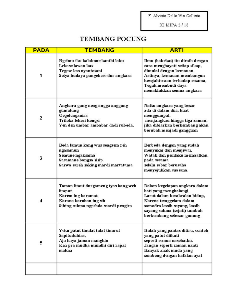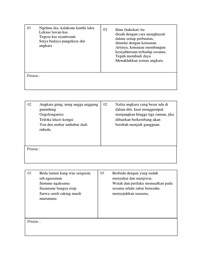 Bila berhasil terbuka derajat kemuliaan hidup yang sebenarnya. Untuk mempersingkat waktu langsung saja kita pelajari lebih mendalam lagi mengenai tembang macapat pocung. 10Basa ngelmu mupakate lan panemu Pasahe lan tapa Yen satriya tanah Jawi Kuna kuna kang ginilut tri prakara.